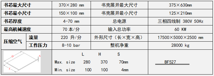 自动调节:通过测量仪测量或键盘输入书壳的长度、宽度、厚度,书芯的长度、宽度、厚度,、控制系统根据开本尺寸自动实现各环节的调节;
