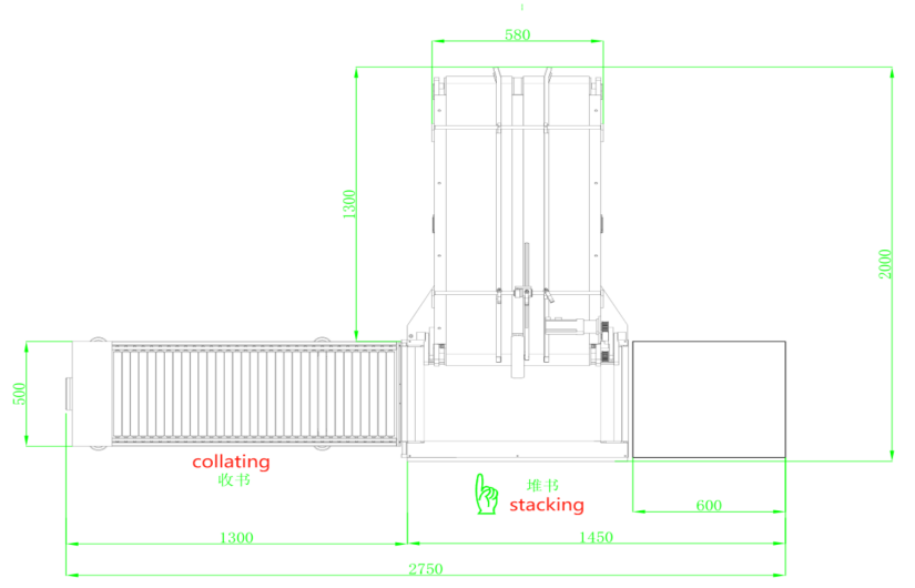 该机链接在自动锁线机的出书口位置,锁好线的书本通过输送带传送至堆积机的储料斗里;输送带上设有一个光电开关用于计数,当储料斗里的书本达到电脑设定的书本数,储料斗的气泵自动将堆叠好的书本推出至收书台,完成堆积,便于收书。